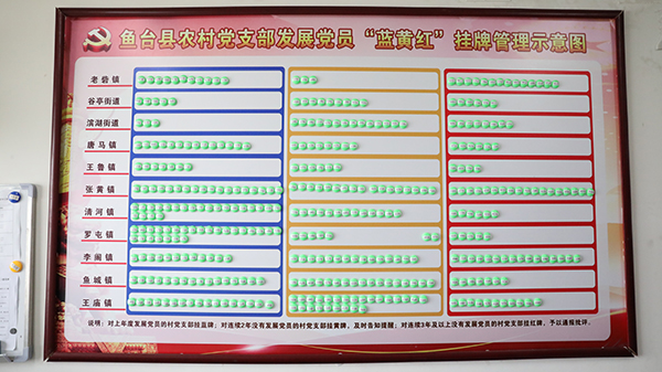 鱼台县探索实行“蓝黄红”三色挂牌动态管理机制,着力优化农村党员队伍年龄结构、破解党组织班子后继乏人难题,努力在全县建设一支规模适度、结构合理、素质优良、能力突出、作风严谨的农村党员队伍。